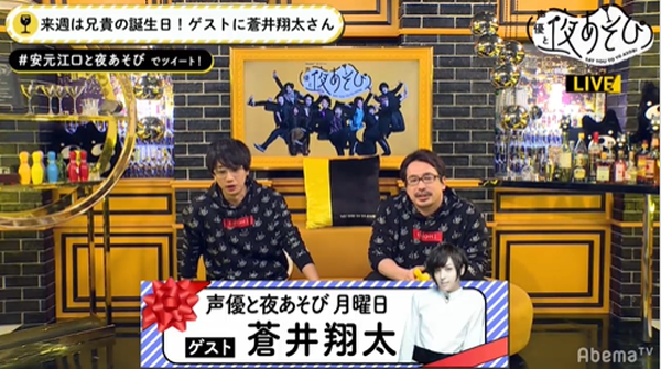 〈「アニメLIVE チャンネル」/『声優と夜あそび【月:安元洋貴×江口拓也】#48 蒼井翔太がゲスト