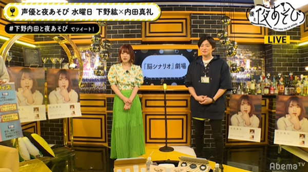“無料で楽しめるインターネットテレビ局”「AbemaTV(アベマティーヴィー)」は「アニメLIVE チャンネル」において、2020 年3 月18 日(水)の夜10 時から夜11 時30 分にわたり、『声優と夜あそび【水:下野紘×内田真礼】#48』を放送いたしました。内田さんの10 枚目のシングル『ノーシナリオ』発売当日である本放送では、新曲のタイトルにちなんだコーナーを実施。「結末は「ノーシナリオ」鬼うまグルメリベンジ!」や、歌詞の内容を取り入れて即興劇を行なう「「脳シナリオ」劇場」、最新シングルについて語る「アーティストインタビュー(※マジのやつ)」、毎週恒例の「ダミヘで癒しアンサー」などを行ないました。