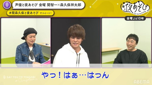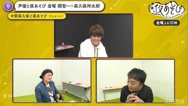 4月24日は、『声優と夜あそび 金【関智一×森久保祥太郎】 特別編 #1』と題し、関智一さんと森久保祥太郎さんに加えて八代拓さんをゲストとして参加し、リモート環境で番組を進行しました。配信内では関さんと森久保さんがさまざまな質問に答える「意外と知らない!?相方アンケート調査」や、八代さんの“森久保