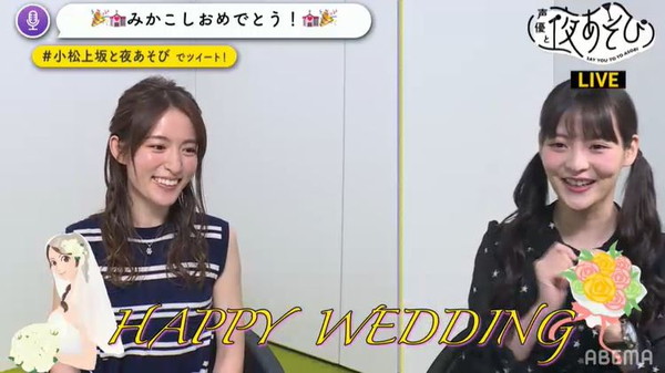 5月13日は『声優と夜あそび 水【小松未可子×上坂すみれ】 特別編 #4』と題し、上坂さんが5月12日(火)に結婚を報告した小松さんを祝福。さらに「噂のあの人が緊急生出演」と題して占い師のミルンさんに2人の相性や番組の今後についてのアドバイスを貰ったり、さまざまな言葉をリズムに合わせて言う「目指せ大流行!新こま~つみかこゲーム」、視聴者の悩みに上坂さんが答える「お悩み解決!?Sみぺ様とお呼びっ!」などのコーナーを行ないました。