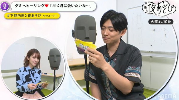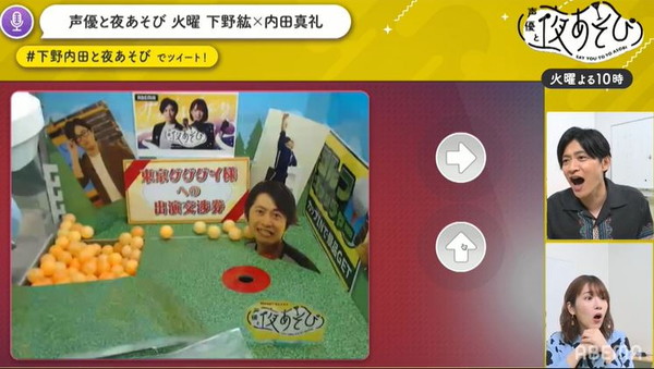 5月12日は『声優と夜あそび 火【下野紘×内田真礼】特別編 #4』と題し、『下野さんと内田さんが「こんなご時世だからこそ オンライン・クレーンゲームをやってみよう!」でクレーンゲームに挑戦したり、さまざまなシチュエーションに対する回答を視聴者にジャッジしてもらう「日頃の悩みを解決!?クイズ!正解は視聴者投票」、視聴者から寄せられた言葉をダミーヘッドマイクに囁く「ダミヘヒーリング 早く君に会いたいな……」などのコーナーを行ないました。