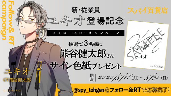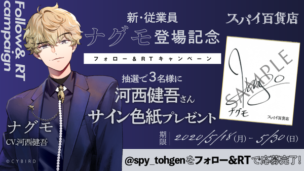 1万リツイート企画を達成した新規女性向けプロジェクト『スパイ百貨店』に新キャラクターが追加された。また、これを記念し、新キャラクターのボイスを担当するキャストの直筆サイン色紙が、抽選で計6名様に当たるTwitterキャンペーンも実施される。