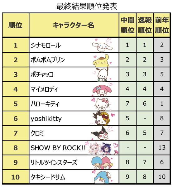今年の第1位は「シナモロール」 (1,387,152票獲得・昨年2位)。速報・中間発表1位からそのまま逃げ切り、2018年から2年ぶり3度目の1位に返り咲いた。第2位は 「ポムポムプリン」 (1,288,245票・昨年3位)、 第3位には1996年以来、24年ぶりのTOP3入りを果たした 「ポチャッコ」 (1,013,927票・昨年5位)が続いた。