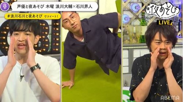 そして、6月8日(月)から、やっと『声優と夜あそび 2020』の新スタジオから配信に。6月11日(木)は『声優と夜あそび 木【浪川大輔×石川界人】 #1 鈴木崚汰がゲストに登場!』と題し、ゲストである鈴木崚汰さんが出演中の『かぐや様は告らせたい?-天才たちの恋愛頭脳戦-』にちなんだコラボ企画「すずきりょうた様を告らせたい!」や、筋力トレーニングが趣味である鈴木さんを交えた「スタッフからの果し状!コレできんのか!フィジカルスペシャル」などのコーナーを行ないました。
