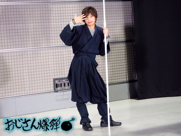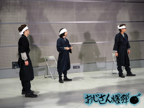 黒い幕が張られたスタジオ。幕がおろされ現れたのは、忍者に扮したUncle Bombの2人。体操“ザムライ”のはずなのになぜ忍者!? ここで、その理由に気が付いたあなたは、早くも『体操ザムライ』通。サムライと言われた体操界の元エース荒垣城太郎が偶然出会った少年、レオナルド。今回の物語のカギを握るこのキャラクターはなんと自称「忍者」。ということで、今回はそれにちなみ、忍者から忍法を学ぶことで刺激を受けもっともっと熱く生きよう! という企画なのである。
