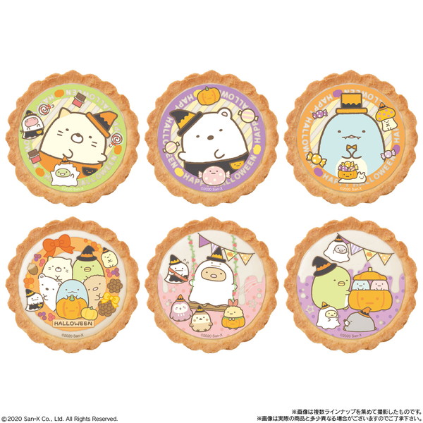 タルトの上には、すみっコたちがそれぞれ、ハロウィンらしいとんがり帽やコスチュームに身をつつみ、秋のパーティを楽しんでいるかわいらしいデザインのフィルムが。フィルムの絵柄は全6種類、パッケージは全2種類のデザインで展開する。