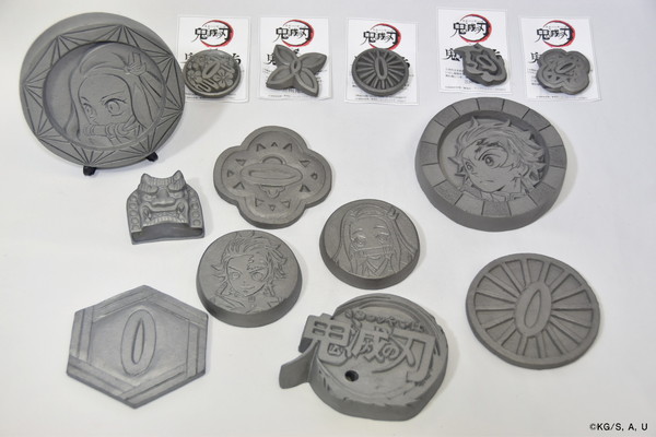 ・鬼師の指導による、瓦粘土の型押しを体験。炭治郎たちがデザインされたペーパーウェイトなどを作る。型押ししたものは、鬼師が専用の窯で焼成し「いぶし銀」に仕上げる。