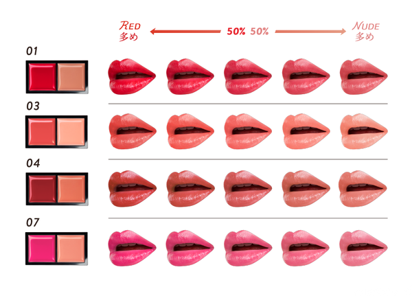 鮮やかな赤い下地にベージュを重ねて、 思いどおりの赤がつくれる、 2色パレットのクリームルージュ。