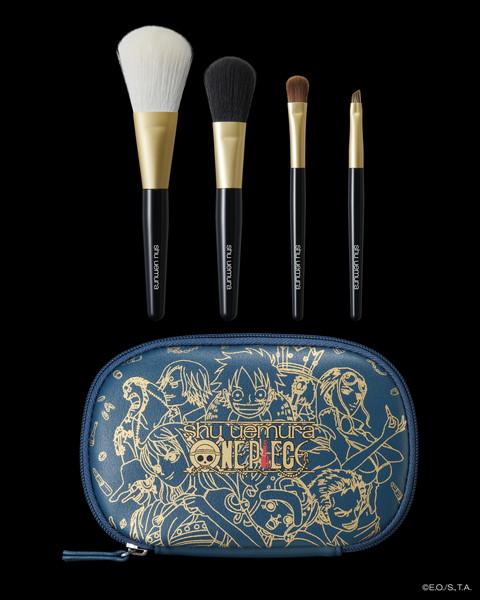 上質なミニブラシは、 パーティシーズンにも便利なポータブルタイプ。ポーチをじっくり見てみて!マリンブルーをバックに、 ルフィと麦わらの一味の手に、 シュウ ウエムラの美のアイテムが!