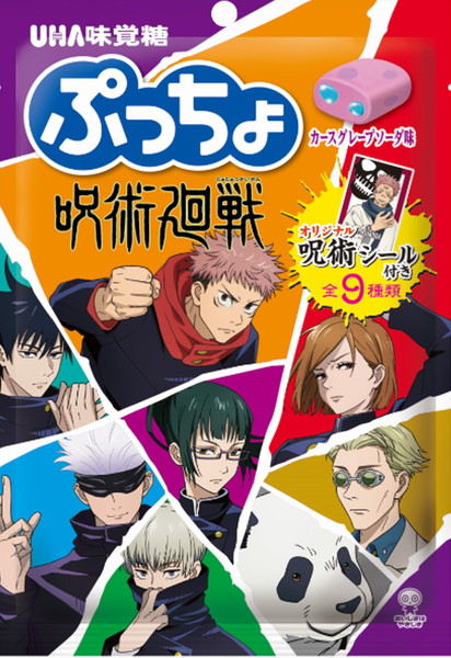 本商品は、現在話題沸騰中の人気アニメ『呪術廻戦』と人気のソフトキャンディぷっちょのコラボ商品企画第一弾。『呪術廻戦』の世界感をイメージしたグレープソーダ味となっており、ぷっちょ特有のぷちぷち食感グミと爽やかなグレープソーダの味わいが楽しめる。オリジナルパッケージは主人公・虎杖悠仁をはじめとする『呪術廻戦』のキャラクター9人が描かれており、アニメの世界観溢れる商品になっている。