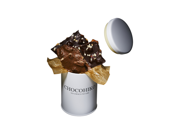 ミルクチョコレートにザクザク食感のブラッククッキーとペカンナッツ、 ビターチョコレートにはカリッと香ばしいアーモンドとヘーゼルナッツを練りこんだ、 2種類の割りチョコレートのアソート缶。