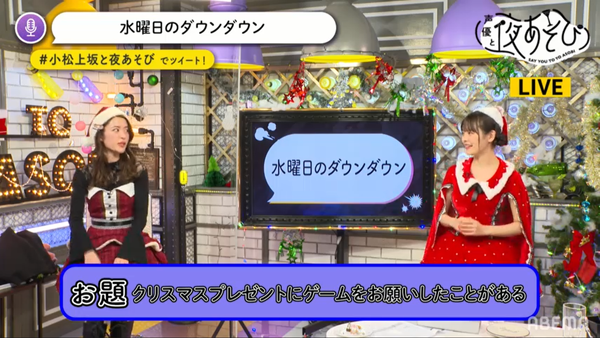 配信内では水曜日の定番コーナー「水曜日のダウンダウン」を実施。「クリスマスプレゼント」をテーマに、視聴者アンケートの「Yes」の結果が指定の%以下になるよう、質問を考えてゆきます。まずは「Yes」84%以下の質問として、小松さんが「クリスマスプレゼントを手紙でお願いしたことがある」を指定します。「学校や幼稚園で書いた人がいるんじゃないかな……」という小松さんに、「幼稚園で書いたことがあります」と頷く上坂さん。小松さんが「兄弟3人で、“ニンテンドー64が欲しい”って手紙に書いた覚えがある!」と幼い頃のクリスマスエピソードを明かすと、一人っ子の上坂さんは「かわいい!」「連名でお願いするっていうのが……兄弟っていいな~!」と羨ましがっていました。