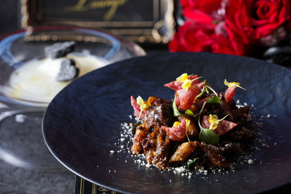 童話“不思議の国のアリス”の“ハートの女王”をテーマに、“ラズベリー”と“ショコラ”を使ったスイーツで可愛く表現した「スイーツスタンド」に、ダークプリンセスの世界を表現した新玉葱のヴルーテとオーガニックオリーヴオイルパルミジャーノ・レッジャーノのアクセント(スープ)と牛頬肉と自家製サルシッチャのラグービーツのアクセント(パスタ)がセットになった、ランチセットが登場。まるで“不思議の国のアリス”の世界に迷い込んだような、非日常の世界が堪能できる。