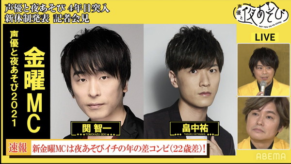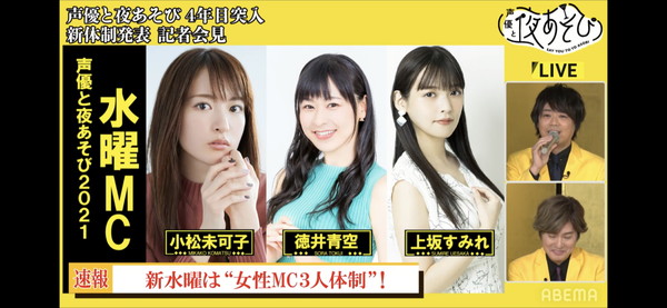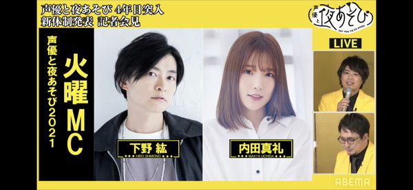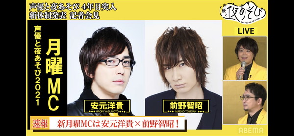 ABEMAにて配信中の『声優と夜あそび』が、2021年4月より4年目に突入。4月3日に「新体制発表記者会見」が行われ、新MCが発表された。