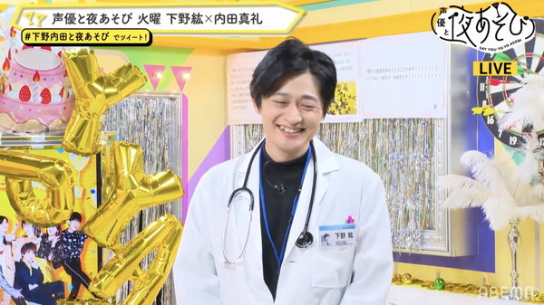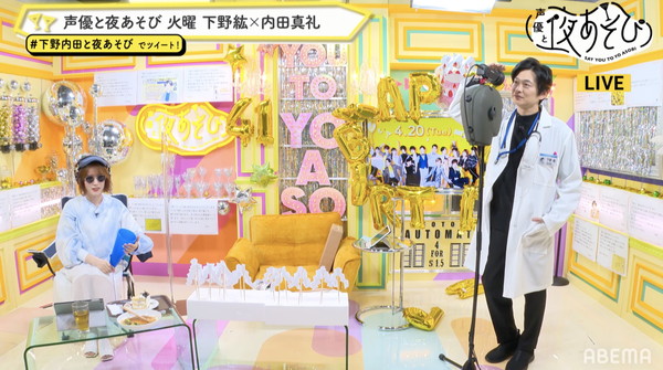 ABEMAにて配信中の『声優と夜あそび』が、2021年4月より4年目に突入。2021年4月20日(火)の『声優と夜あそび 火【下野紘×内田真礼】#2』の放送では、下野紘さんの誕生日を祝う『祝 紘くんの41歳バースデーSP』を実施。前回(#1)の放送で決めた医者の衣装へ“ナマ着替え”をする「誕生日恒例!紘くんのナマ♡着替え」や、「紘くんのクエスチョン41」「巨匠、真礼監督によるタケルみ劇場」などのコーナーを行いました。
