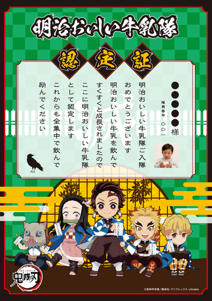 「鬼滅の刃」×明治おいしい牛乳隊 オリジナル認定証プレゼントキャンペーン 特設サイト:https://www.meiji.co.jp/products/brand/meijioishiigyunyu/open2104/