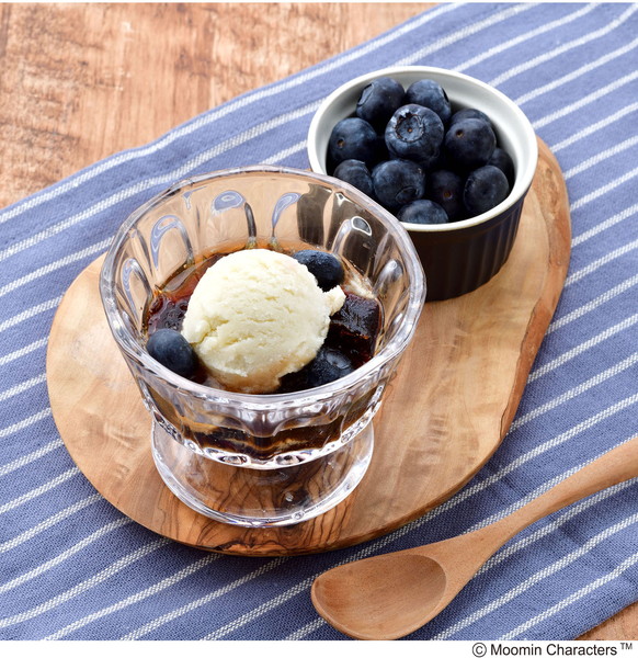 フィンランドの香り豊かなブルーベリーコーヒーをさわやかなゼリーに仕立て、アイスクリームとブルーベリーを添えました。ムーミンカフェならではのデザートです。