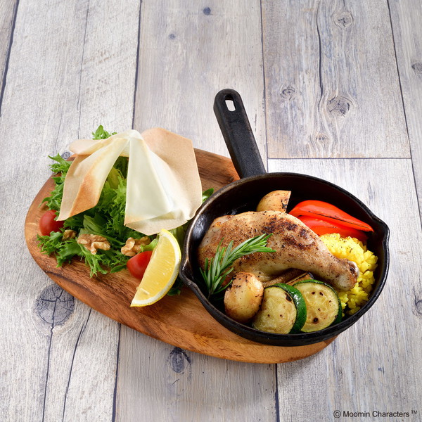 グリルしたジューシーな骨付きチキンに色鮮やかな温野菜とターメリックライスを添えたボリューム満点のメニューです。