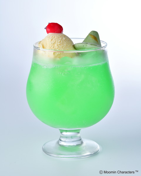 エメラルドグリーンのソーダにスナフキンの帽子とバニラアイスが浮かぶクリームソーダです。