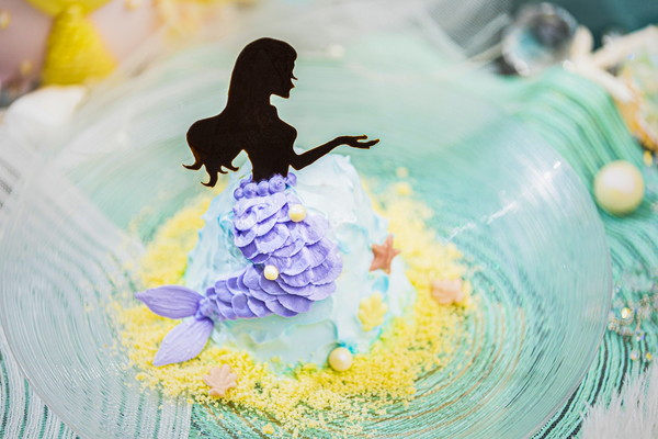 美しいマーメイドプリンセスのドレスケーキ、三段のスイーツスタンドにはパールや貝殻をイメージした可愛らしいスイーツを用意。おとぎ話に出てくるようなプリンセスの世界を表現したスイーツと会場装飾とともに優雅なティータイムが楽しめる。