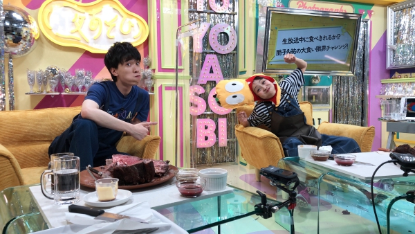 『声優と夜あそび』の特別回として放送された本番組では、金田さん、畠中さんが初タッグ。大食いだという2人が超巨大ステーキに挑戦する「生放送中に食べきれるか!?朋子&祐の大食い限界チャレンジ」を行いました。