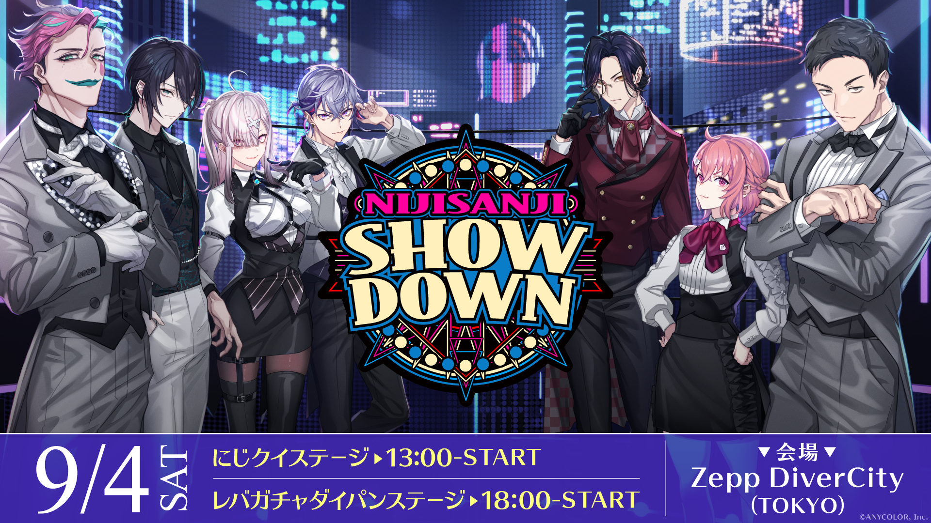 「NIJISANJI SHOW DOWN」広告:有楽町、蒲田、横浜、御徒町、田端、北千住、駒込、渋谷、新宿、中野、阿佐ヶ谷、吉祥寺、武蔵小金井、武蔵小杉、長津田、錦糸町