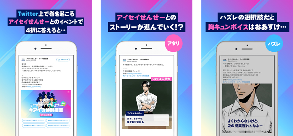 アイの特別授業は、Twitterの回答機能(カンバセーショナル機能)を使い、恋愛シュミレーションゲームのようにアイセイせんせーとのやり取りが体感できるTwitterコンテンツです。