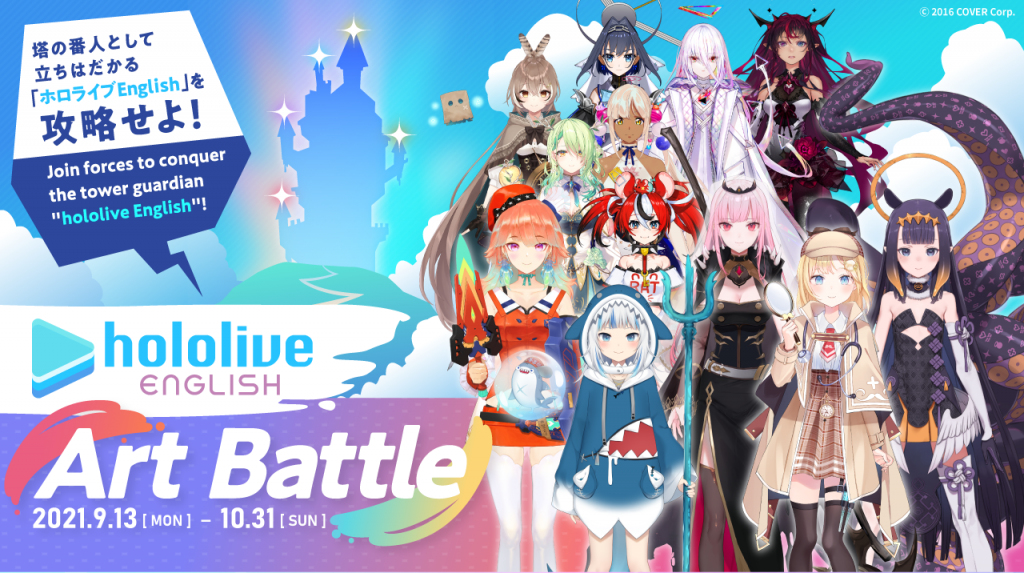 カバー株式会社は、当社が運営する英語圏向けVTuberグループ「ホロライブEnglish」の1周年企画として、「pixiv」において、2021年9月13日~10月31日23:59の期間、イラストコンテスト「hololive English Art Battle」を開始することをお知らせいたします。