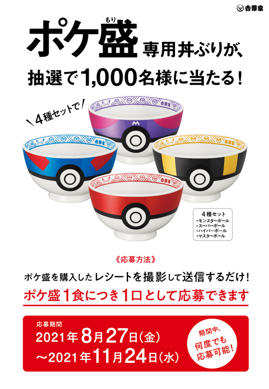 『ポケ盛』購入時のレシートを撮影し、吉野家公式Twitterをフォローの上、ダイレクトメッセージに送信した方の中から、抽選で1,000名様にモンスターボール、マスターボール、スーパーボール、ハイパーボールをデザインした“ポケ盛専用丼ぶり”をセットにしてプレゼントします。“レシートキャンペーン”の開催期間は11月24日までです。