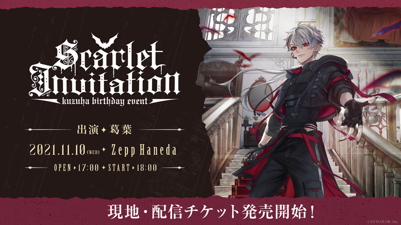ANYCOLORが運営するVTuber/バーチャルライバーグループ「にじさんじ」より、所属ライバー「葛葉(くずは)」のソロイベント『Kuzuha Birthday Event 「Scarlet Invitation」』を、Zepp Hanedaにて2021年11月10日に実施することを発表いたします。