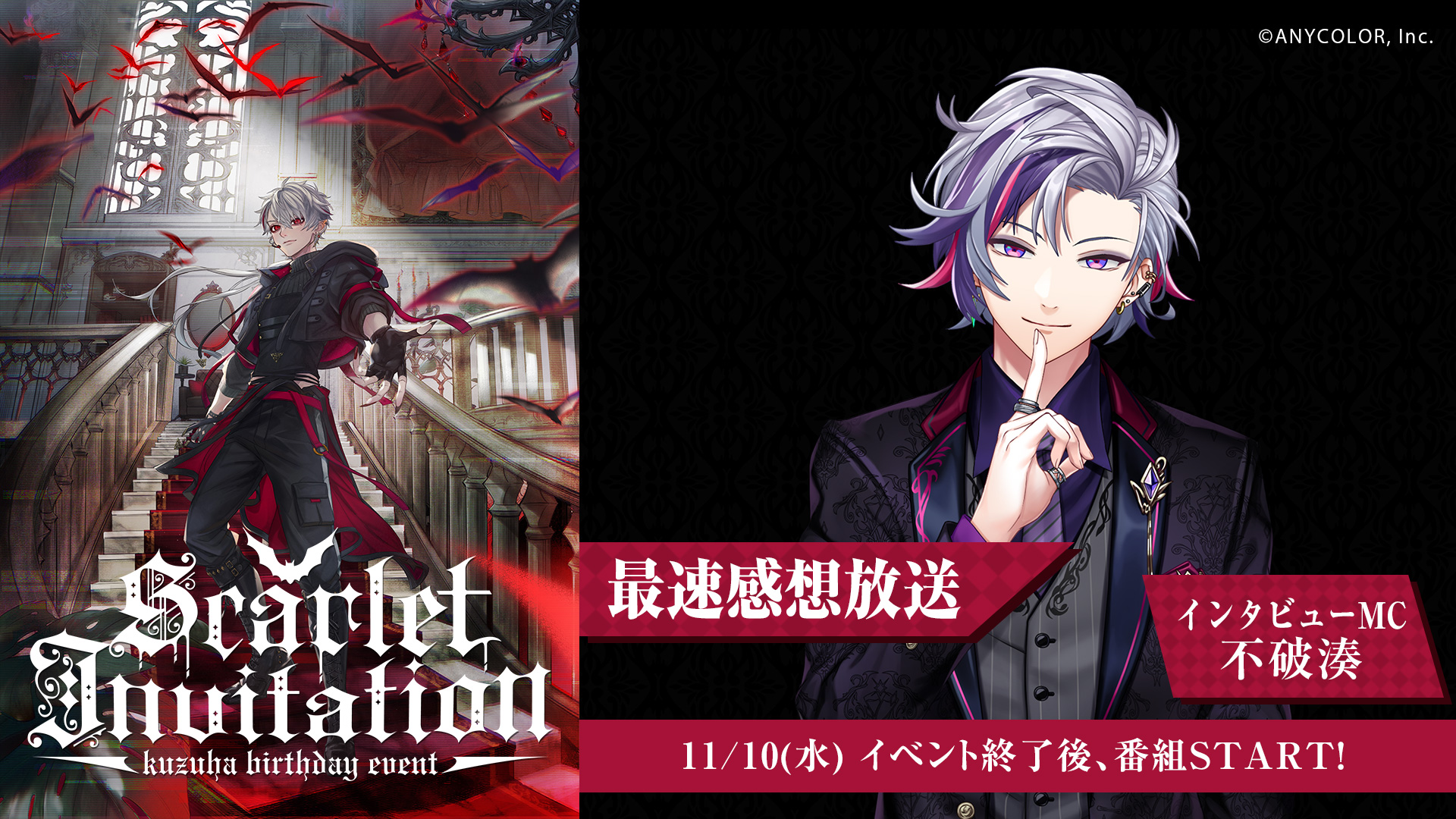 ニコニコ生放送では、11月10日18:00よりKuzuha Birthday Event 「Scarlet Invitation」を配信致します。また、イベント直前番組、最速感想放送も合わせてお送り致します。イベント本編とあわせてお楽しみください。
