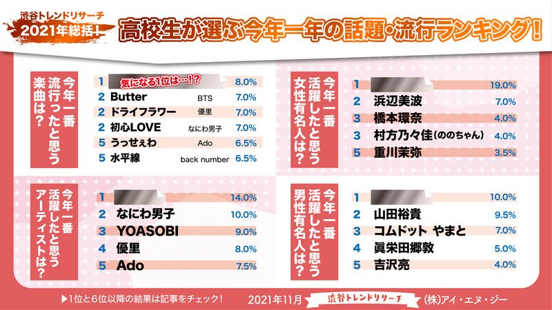 第1位には、「BTS(14.0%)」がランクイン。理由には、「今年一年どこでも流れてた(高3男子)」、「Butter がとても流行ったと思いました!(高1女子)」、「知らない人がいなくなったし、今までBTSに興味がなかった人も曲が歌えるから(高1女子)」などが回答されました。