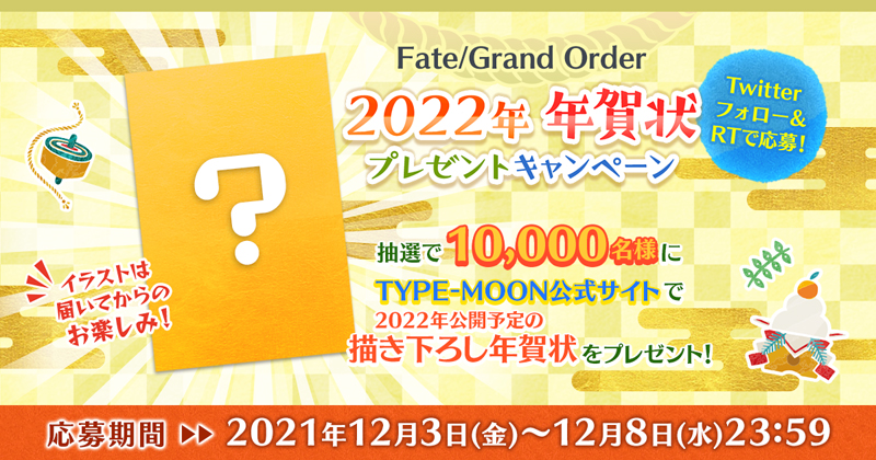 本キャンペーンでは、FGO公式Twitterをフォローし、対象のキャンペーンツイートをリツイートした方の中から、抽選で10,000名に、TYPE-MOON公式サイトで2022年公開予定の描きおろし年賀状をプレゼントいたします。