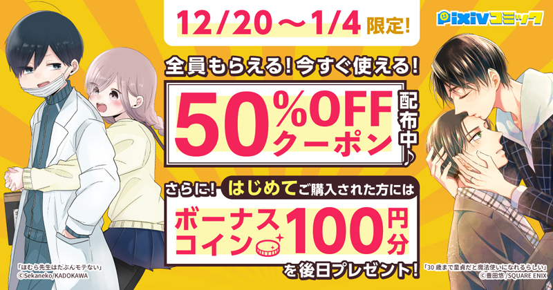 pixivコミックストアの全作品を対象とした50%OFFクーポンをユーザーの皆さまに配布いたします。さらに、キャンペーン期間中に初めてpixivコミックストアでマンガをご購入いただいた方全員に、ボーナスコイン100円分を後日プレゼントいたします。