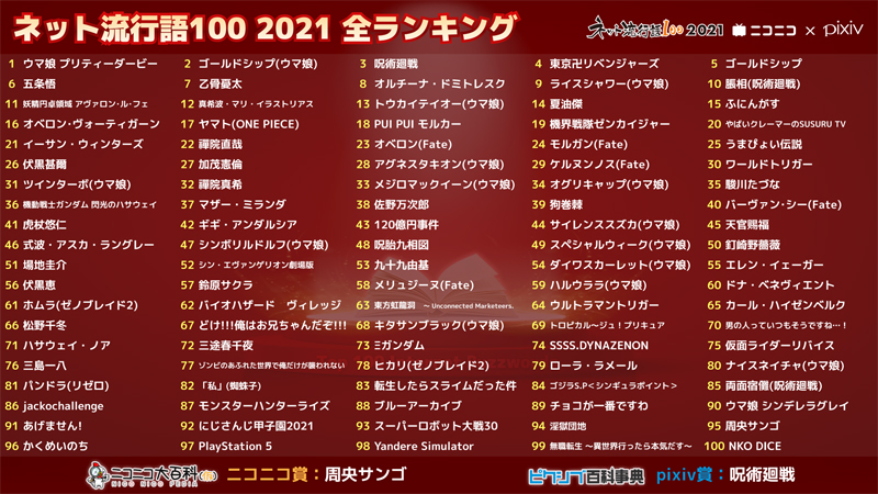 『ウマ娘 プリティーダービー』が“ネット流行語100”2021年間大賞に! ニコニコ賞は『周央サンゴ』、pixiv賞は『呪術廻戦』