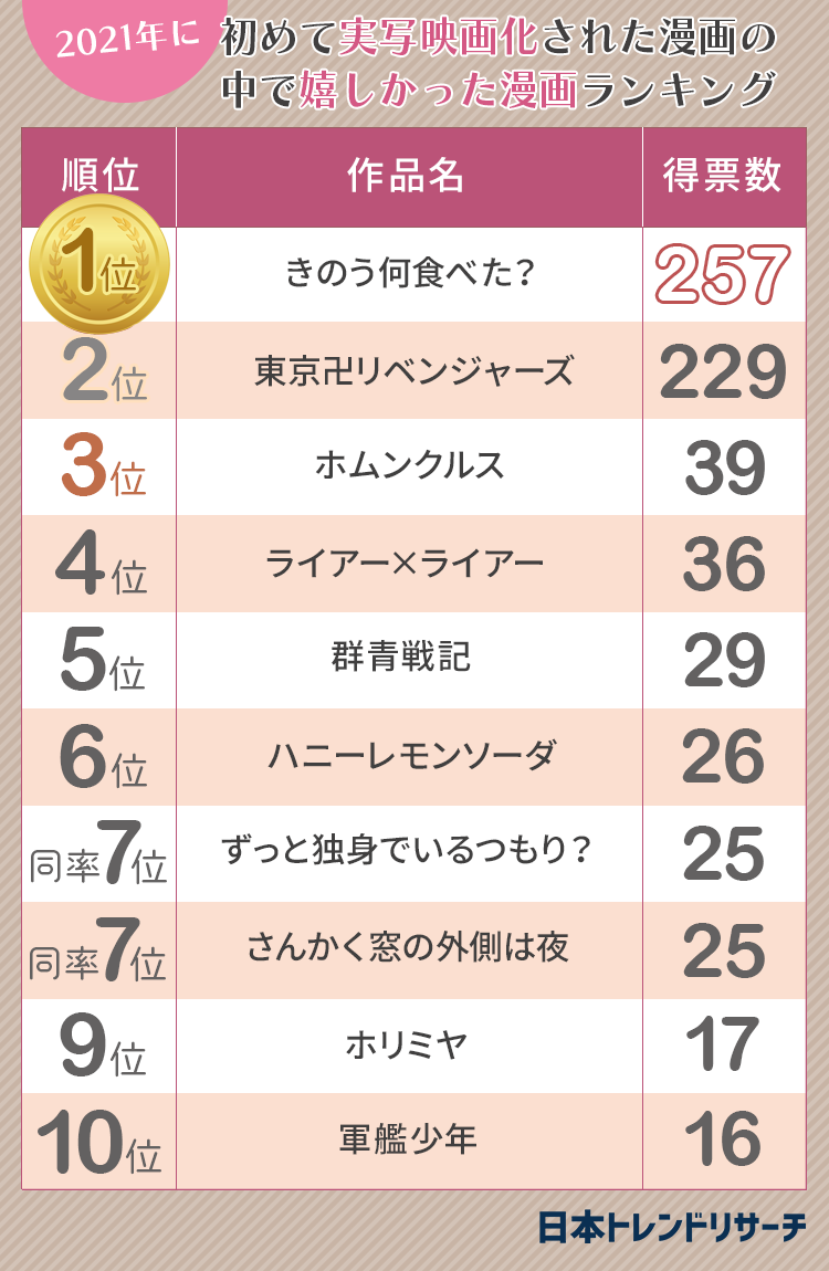 第2位にランクインした『東京卍リベンジャーズ』は、迫力あるシーンが多く、実写映画化してスクリーンの大画面で見てみたかったという方が多いようです。今年もどのような漫画が実写映画化されていくのか楽しみですね!