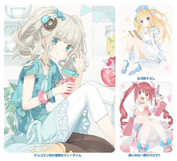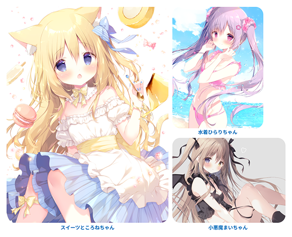 “スイーツ”をテーマにした描き下ろし5枚を含む、合計13枚のイラストブロマイドを手に入れることができます。プリント代金の一部が各クリエイターに還元されるため、ファンがクリエイターのイラストをプリントすることが、そのままクリエイターの活動支援につながります。