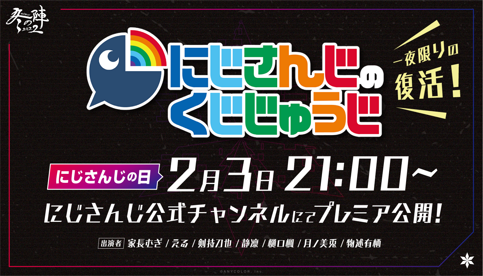 2月3日は「にじさんじの日」! この日に合わせ、2018~2019年に掛けて放送された人気番組「にじさんじのくじじゅうじ」が、一夜限りで復活!お楽しみに!