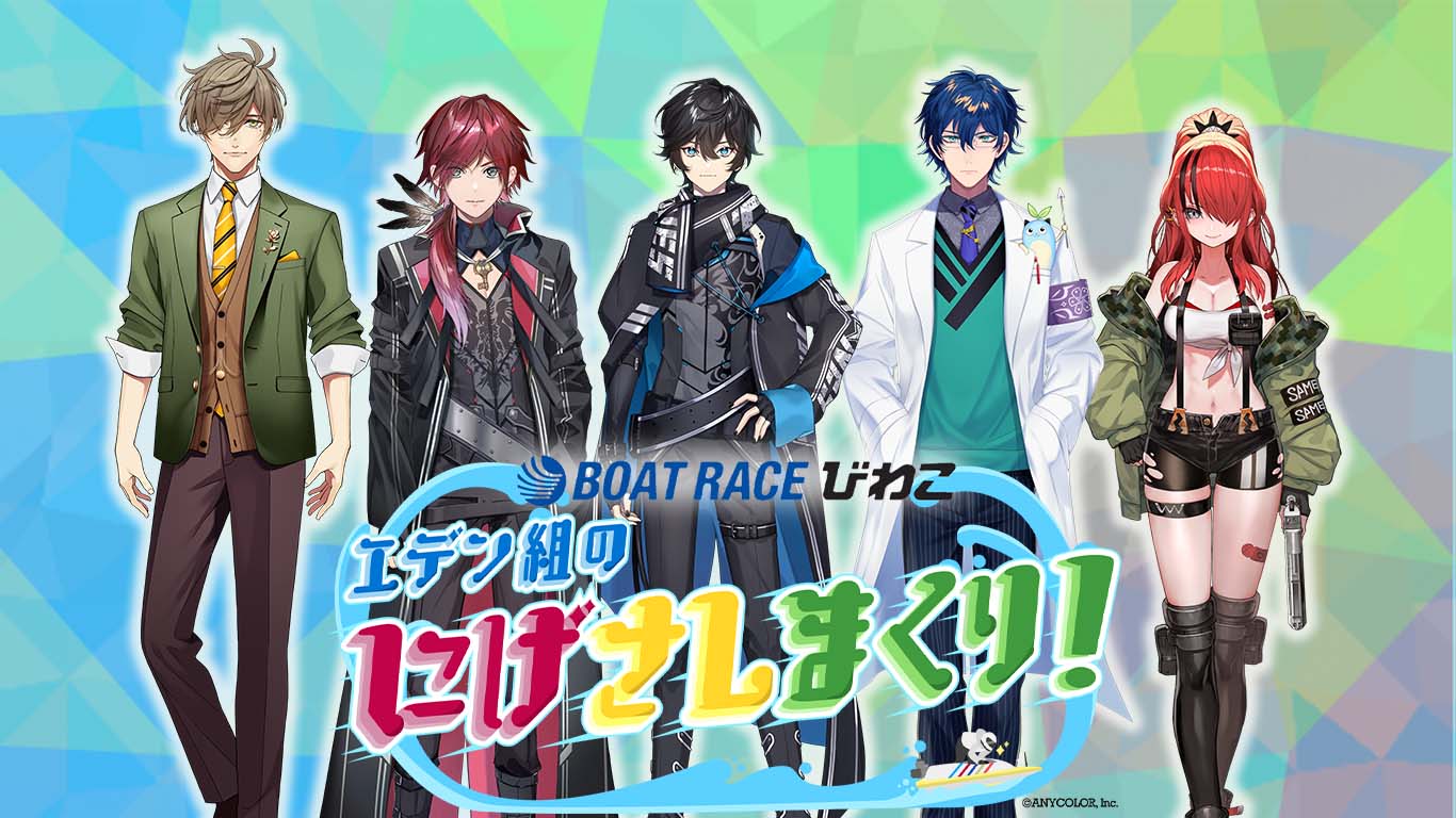 “エデン組のにげさしまくり!”はVTuber/バーチャルライバーグループ“にじさんじ”のユニット“エデン組”(オリバー・エバンス、ローレン・イロアス、アクシア・クローネ、レオス・ヴィンセント、レイン・パターソン)の5名がボートレースびわことコラボし、ボートレースの生配信や動画配信を行うプロジェクトです。
