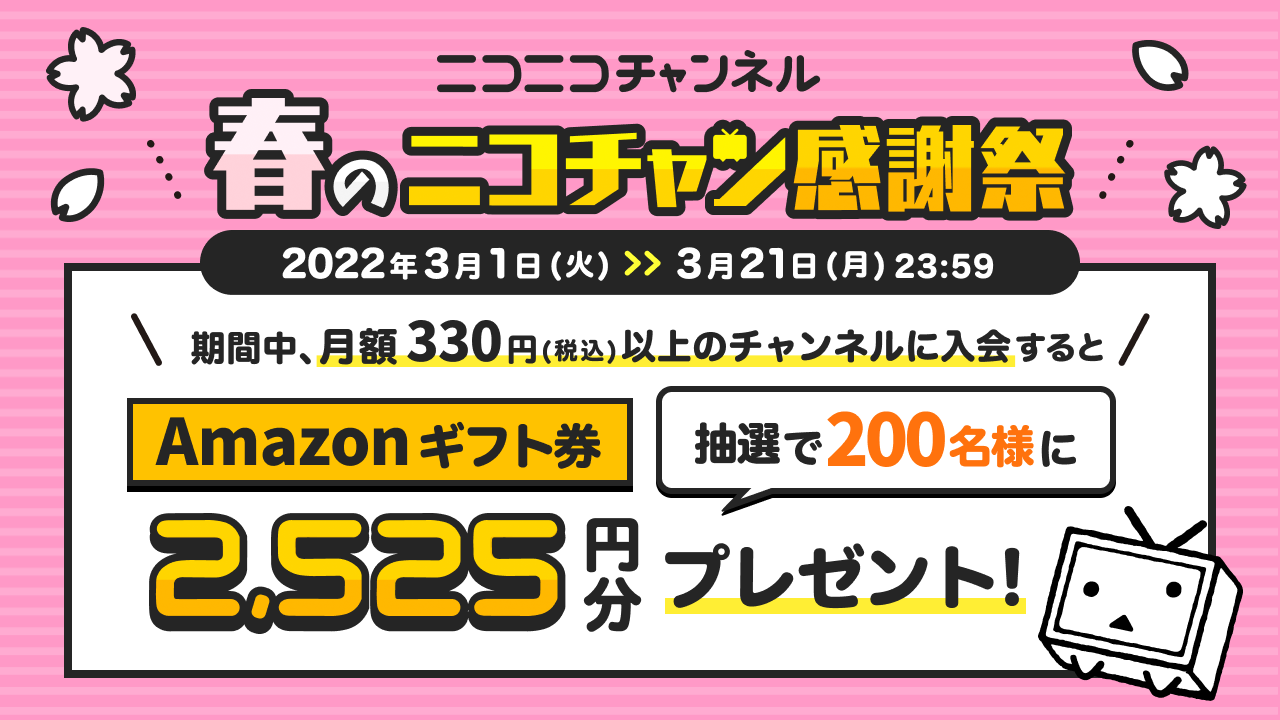 期間中、月額330円(税込)以上のニコニコチャンネルに1つ以上入会して応募すると、抽選で200名にAmazonギフト券2,525円分が当たります。