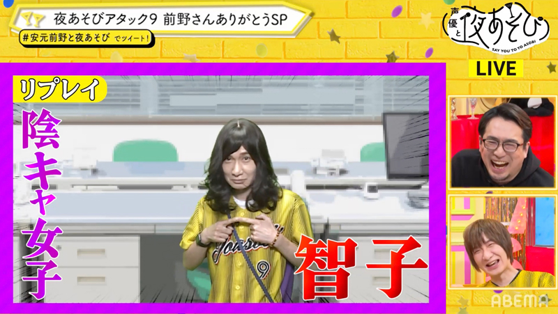『声優と夜あそび 2021』シーズンの月曜日最終回となる本放送では、「夜あそびアタック9 前野さんありがとうSP」を実施。名場面VTRで前野さんの“昇天シーン”や“七変化”を振り返ったほか、最後には、2人で思い出を語りながらキャッチボールをする「Mondayキャッチボール」も行われました。