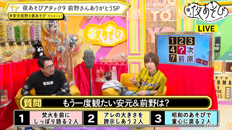また、視聴者に4択のアンケートを実施し、一番多い答えを当てるアンケートアタックからは、「前野さんのユニフォームで一番似合っているのは?」、「もう一度見たい安元&前野は?」などの問題が出題され、誕生日会でユニフォームを作ったことや、なかなか外ロケができず室内で擬似焚き火体験をしたことを思い返し、2人は「(誕生日のユニフォームは)一緒に作ったから俺もすごく印象に残ってる!」、「(焚き火)やってみたら面白かった!」、「いい雰囲気味わえましたね」と懐かしんでいきました。