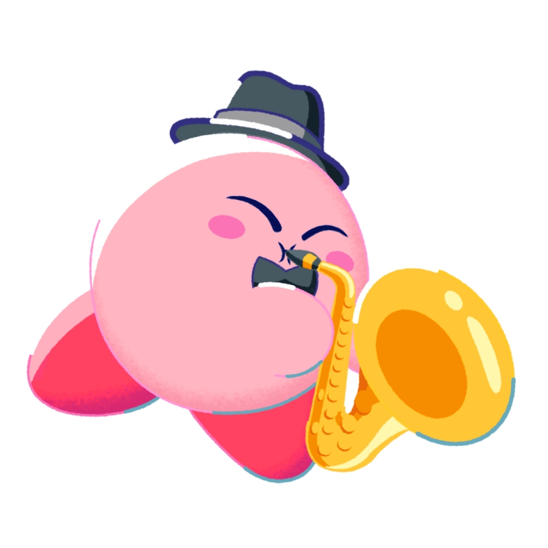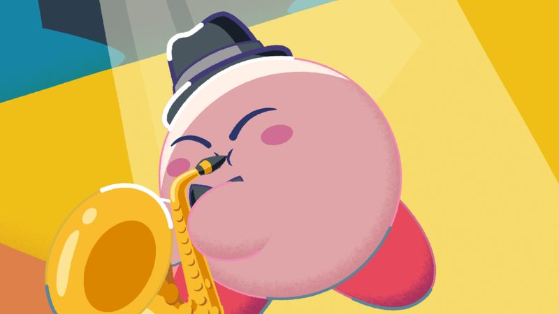 ジャズのムーディな空気を吸い込んだカービィ。ハットでおめかしして、ちょっぴり大人っぽくサックスを奏でる!