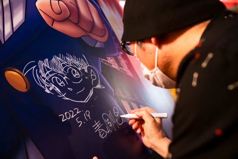 サプライズとして、青山氏はシネマ4-Dストアの店舗にラッピングされたコナンのビジュアルにサインとコナンを描かれました。また、喫茶ポアロを再現した“ロンバーズ・ランディング”のテラスにもサインと、あの登場人物を描かれています。是非、パーク内で探してみてください。