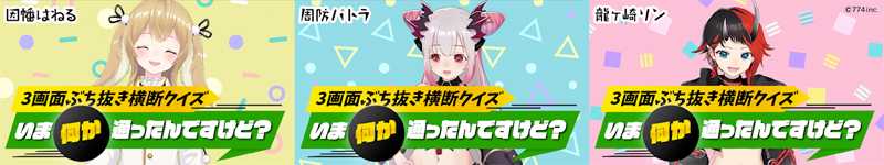 人気Vtuberが数多く所属する774inc.より周防パトラ、因幡はねる、龍ヶ崎リンがクイズに参戦!画面を横切る様々な“何か”を見破ることができるのか。“何か”に翻弄される彼女たちのリアクションや珍回答も必見です。