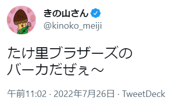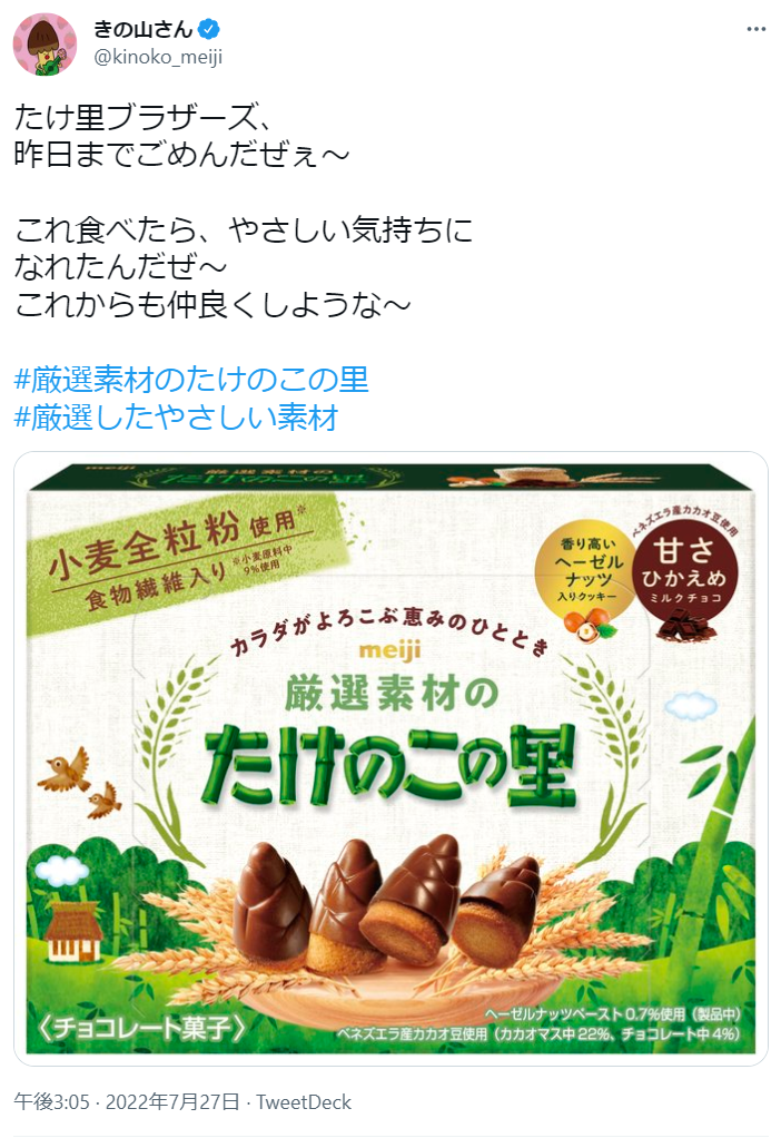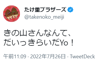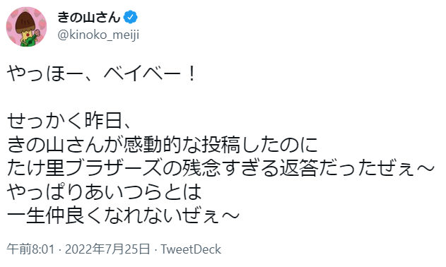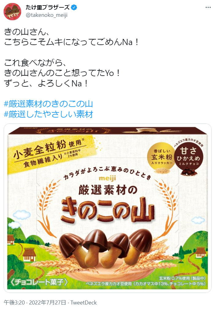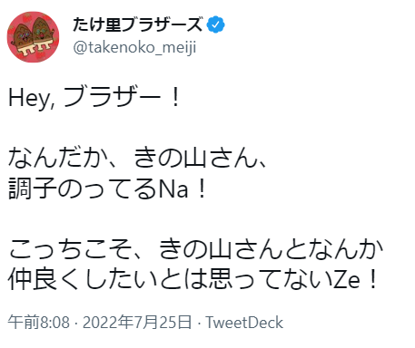 『きのこの山』公式アカウント“きの山さん”と『たけのこの里』公式アカウント“たけ里ブラザーズ”で、急遽両者がTwitter上で仲直りし始めるという、驚きの展開が起きています。