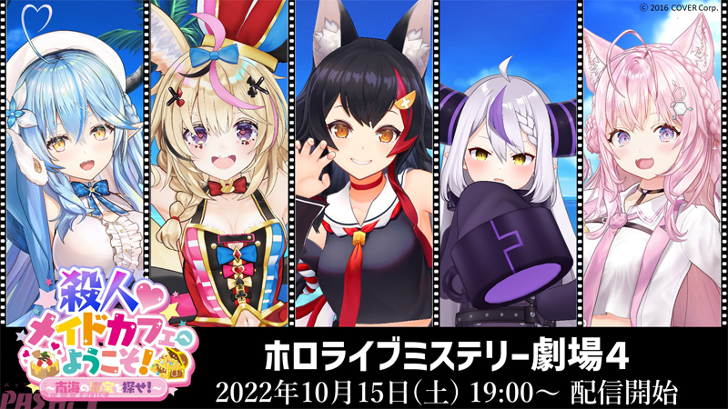 ドワンゴは、同社が運営するライブ配信サービス“ニコニコ生放送”で、10月15日、カバーが運営するVTuberグループ“ホロライブ”所属タレントによる“マーダーミステリー”番組、ホロライブミステリー劇場4『殺人(ハート)メイドカフェへようこそ!~南海の秘宝を探せ!~』を生放送します。
