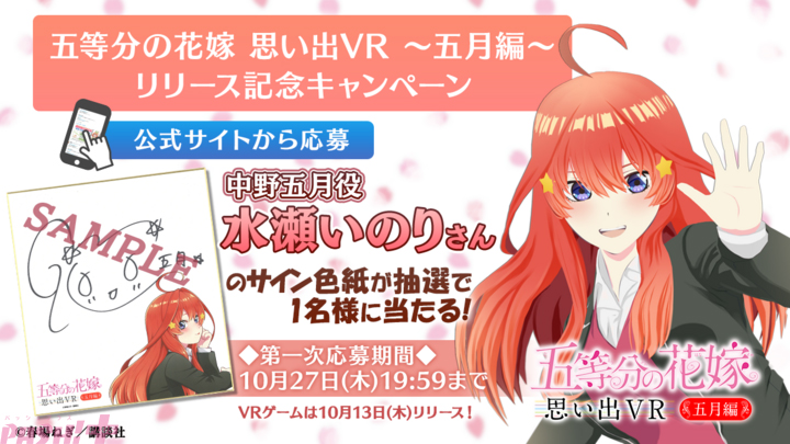 本作の声優を務めるのはもちろん、アニメ『五等分の花嫁』で中野五月役を務めた水瀬いのりさんです。リリース記念として、水瀬いのりさんのサイン色紙を抽選でプレゼントします。