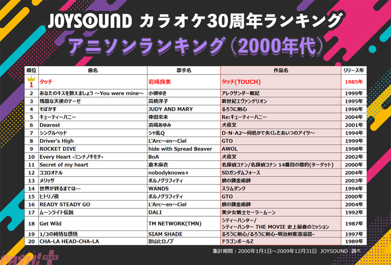 着メロや着うたが大流行し、音楽配信が活発化しはじめた2000年代。アニメにおいては、『千と千尋の神隠し』(2001年)など、世界からも注目を集める作品が誕生する中で、意外にも1位に輝いたのは岩崎良美さんの『タッチ』。『タッチ(TOUCH)』は、1985年に放送を開始した作品ながら、本放送終了後もたびたび再放送されたことで、本楽曲もカラオケの超ロングヒット曲に!