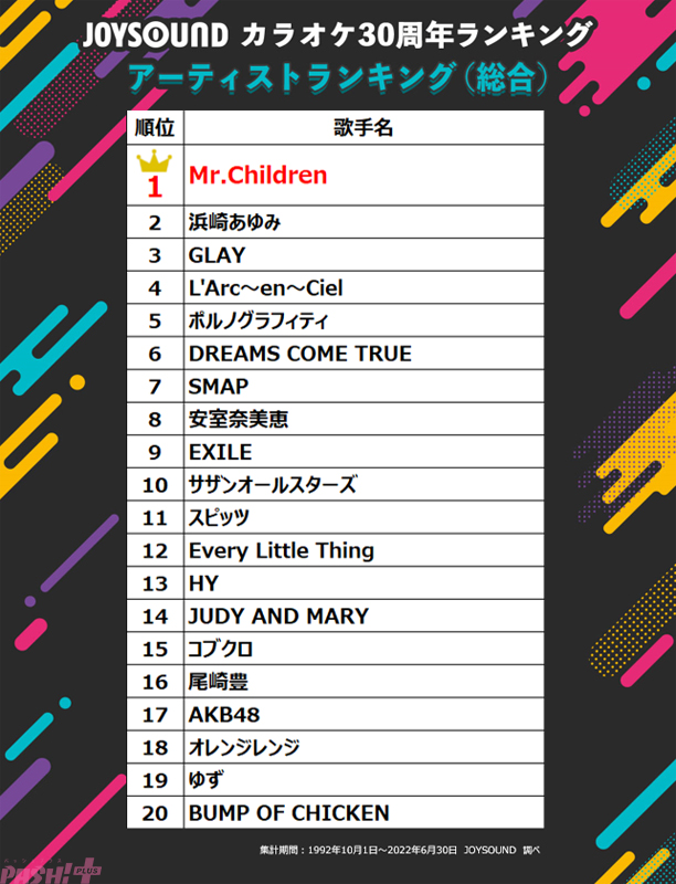 アーティスト別では、通信カラオケJOYSOUNDが誕生した1992年にメジャーデビューし『HANABI』を筆頭に数々のヒットソングを世に送り出しているMr.Childrenが首位に。2位には、代表曲の『M』をはじめ、数多くのミリオンセラーを記録し、平成を代表する歌姫であり、今もなお活躍を続ける浜崎あゆみさんがランクイン。